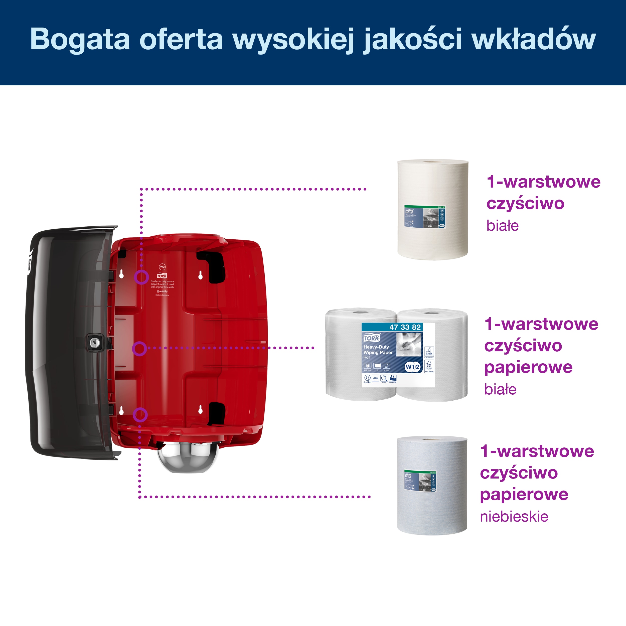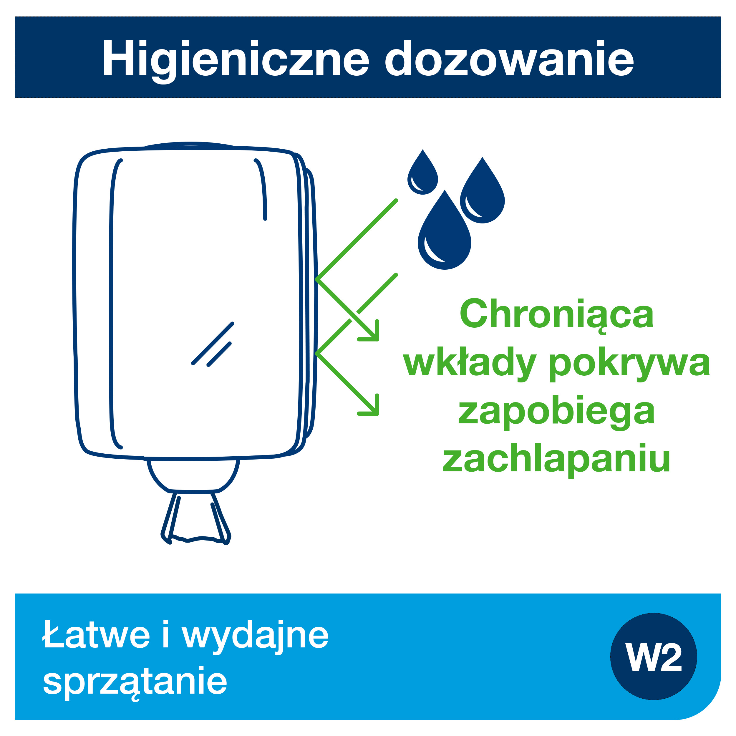 Łatwa i bezproblemowa obsługa dzięki możliwości dozowania czyściwa jedną ręką, dużej pojemności i prostemu systemowi uzupełniania wkładów.