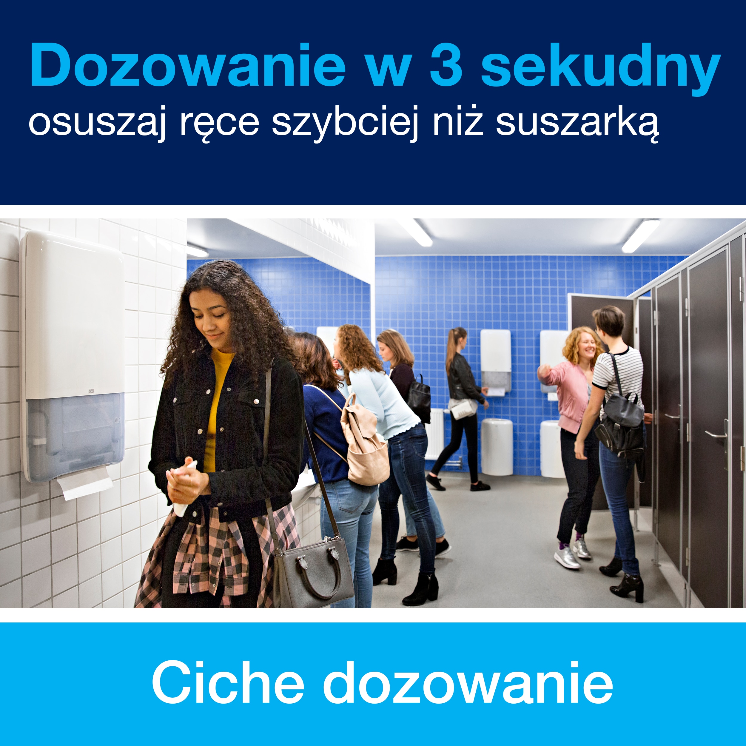 Tork PeakServe® niekończący się ręcznik do rąk: Obsługa łazienek o dużym natężeniu ruchu wiąże się z wyzwaniami, takimi jak brak ręczników, długie kolejki czy marnotrawstwo produktu. Ręcznik papierowy Tork pomaga uniknąć tego typu problemów. W dozownikach zmieści się o 250% więcej ręczników, co redukuje czas wymagany na obsługę dyspenserów, dzięki czemu personel może zająć się innymi zadaniami. Opatentowany system umożliwia pobieranie produktu odcinek po odcinku w ciągu 3 sekund, co zapobiega marnotrawstwu i tworzeniu się kolejek.