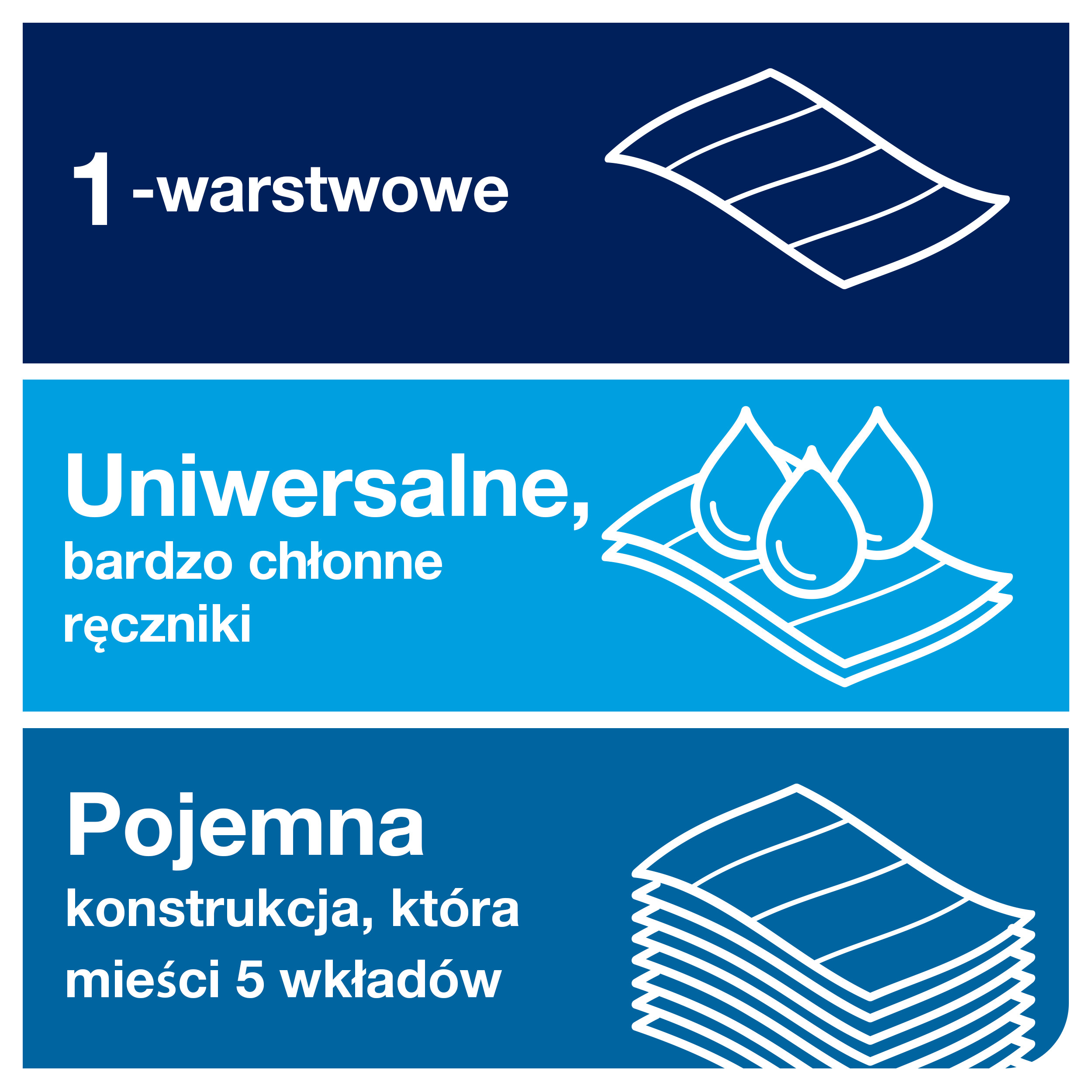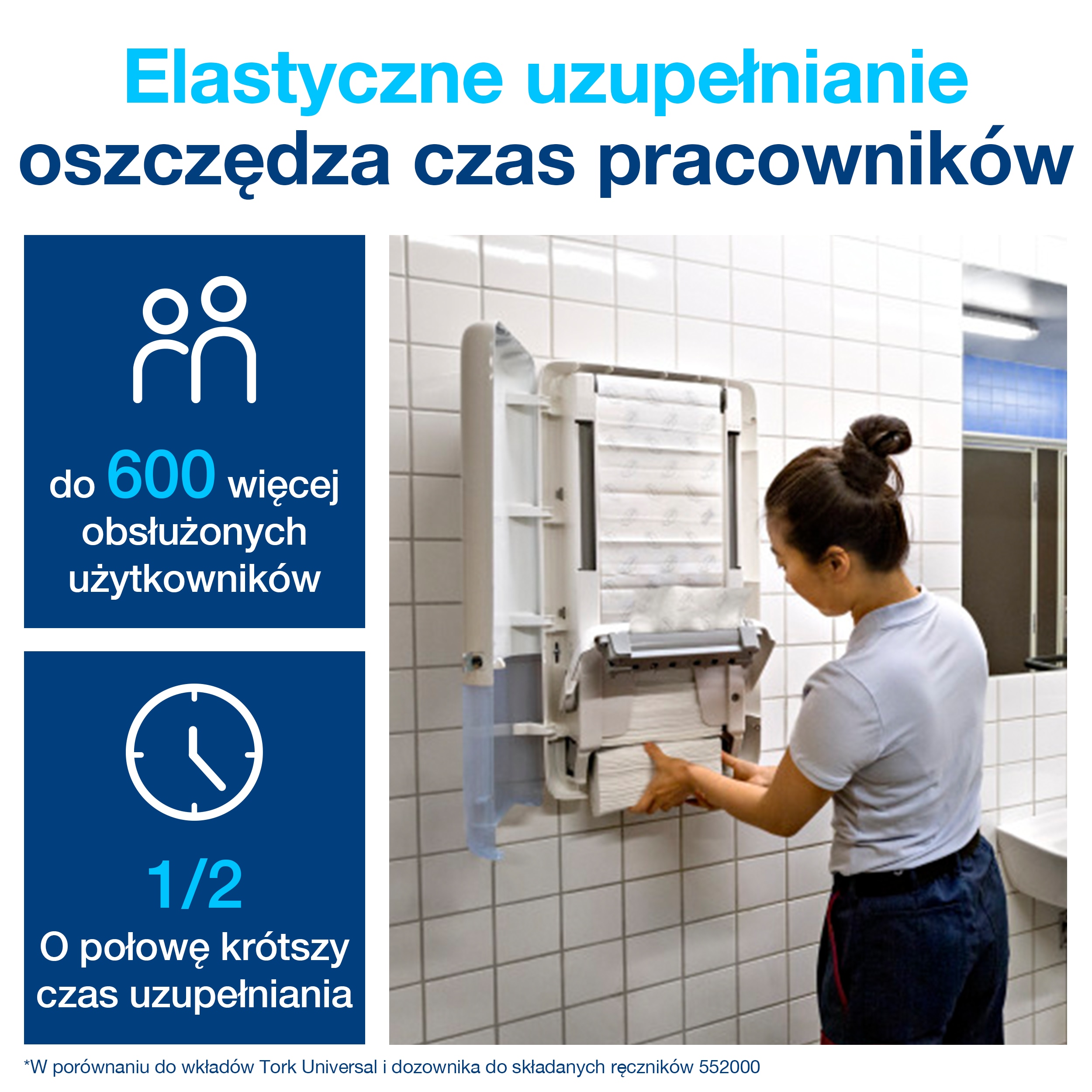 Zapomnij o ciągłym uzupełnianiu dozownika dzięki opatentowanemu systemowi, który pomieści o 250% więcej ręczników (w porównaniu do ręczników Tork w jakości Universal).
