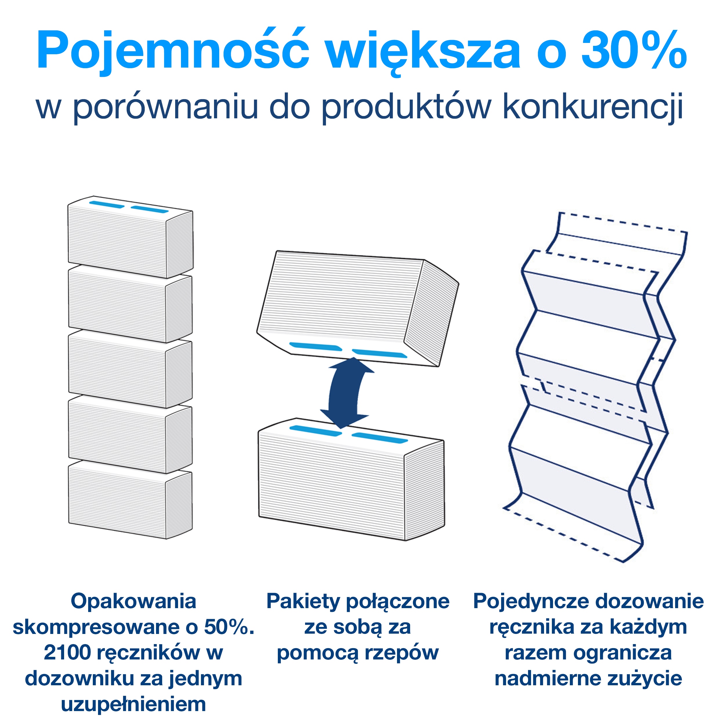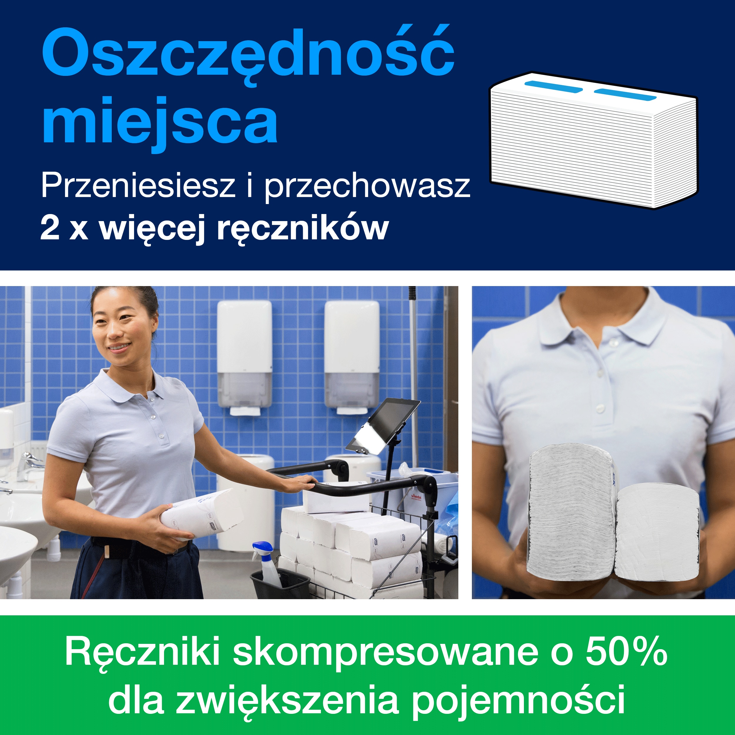 Skompresowanie ręczników papierowych o 50% zmniejsza liczbę koniecznych kontroli i sprawia, że produkt wystarcza na dłużej.