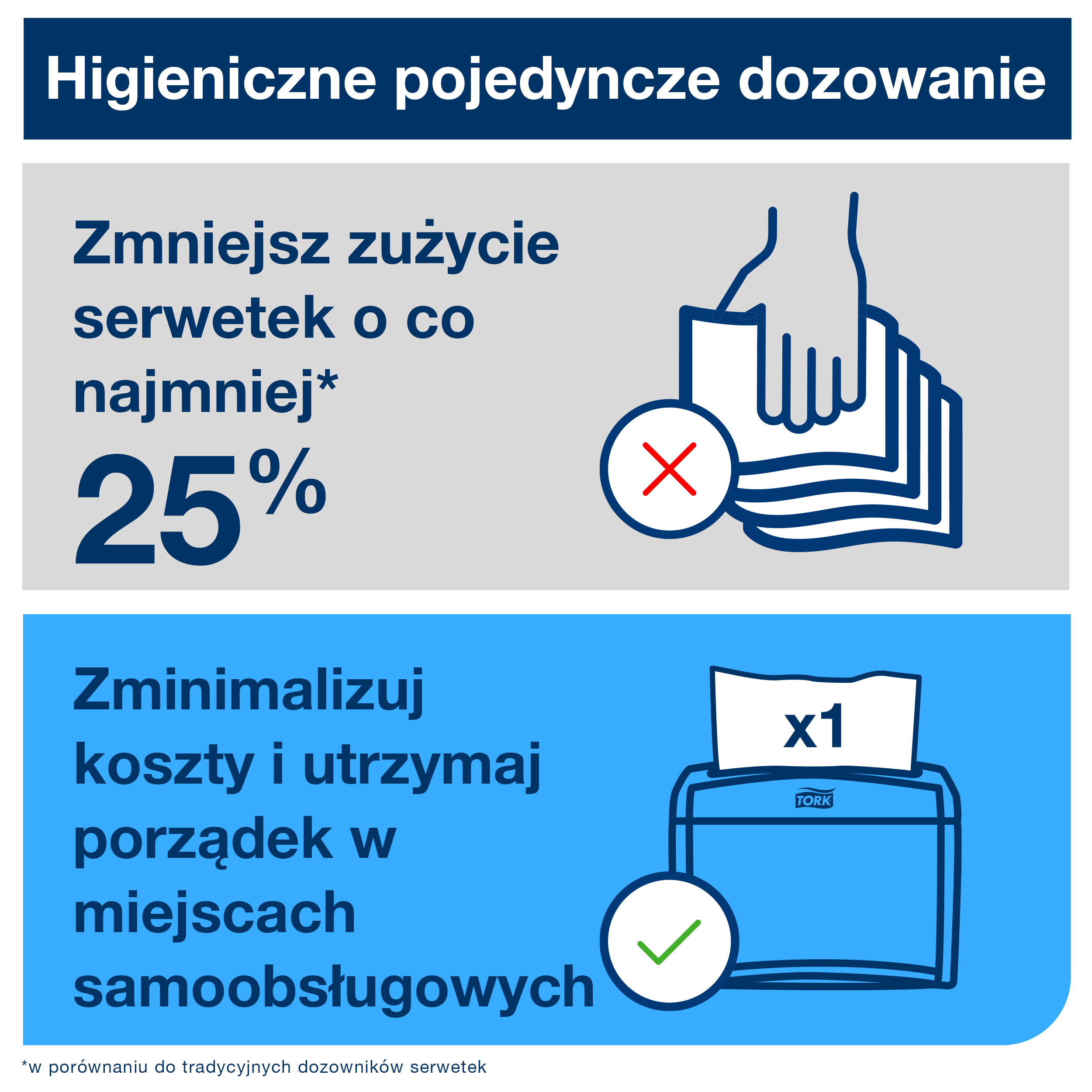 Zmniejsz ilość zużytych serwetek dyspenserowych — pojedyncze dozowanie pomaga kontrolować zużycie i koszty.
